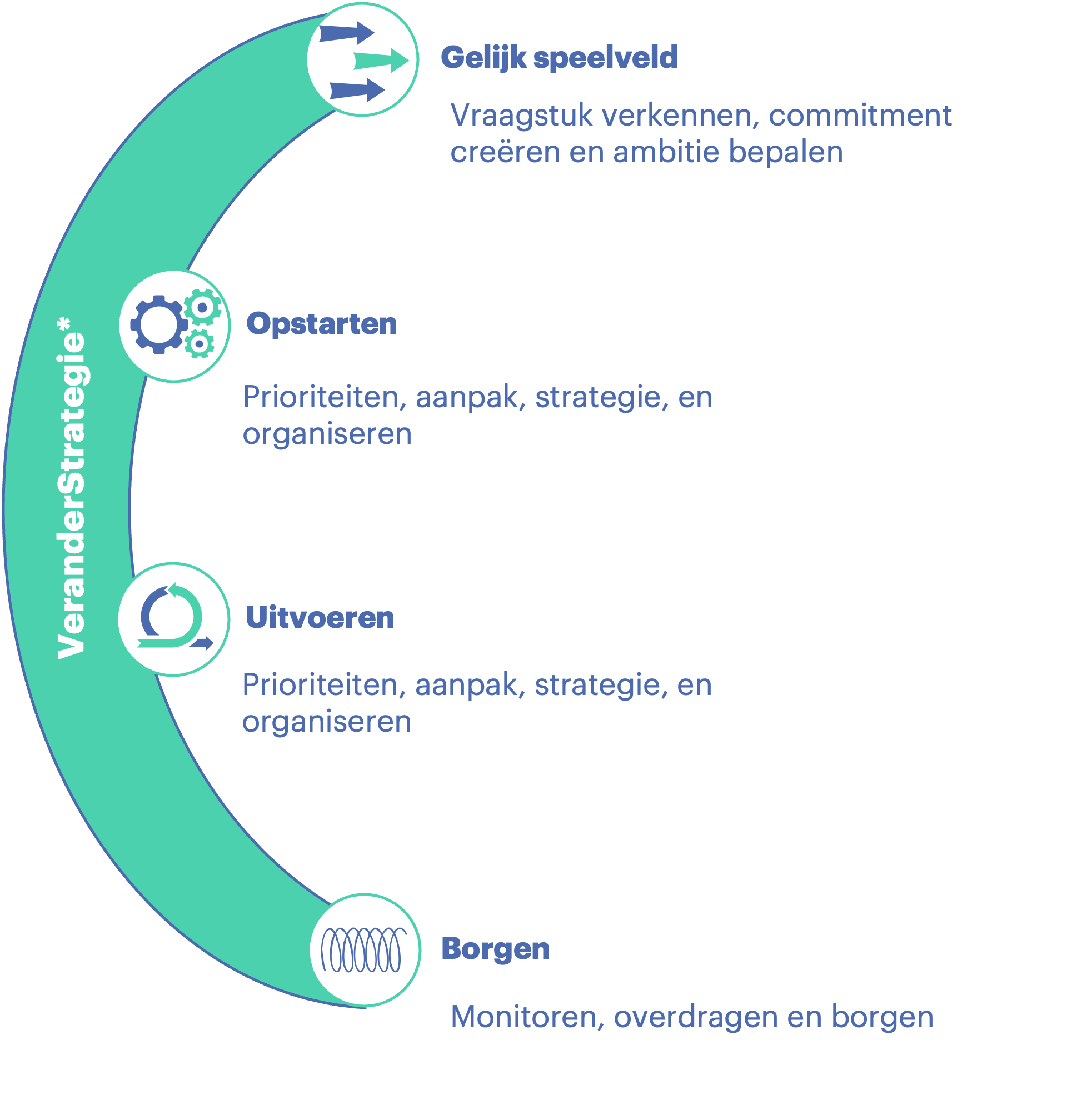 Borgen: In de laatste fase zorgen we ervoor dat de veranderingen worden gemonitord, overgedragen en geborgd binnen de organisatie. Dit zorgt voor continuïteit en de mogelijkheid om, indien nodig, terug te keren naar de opstartfase.