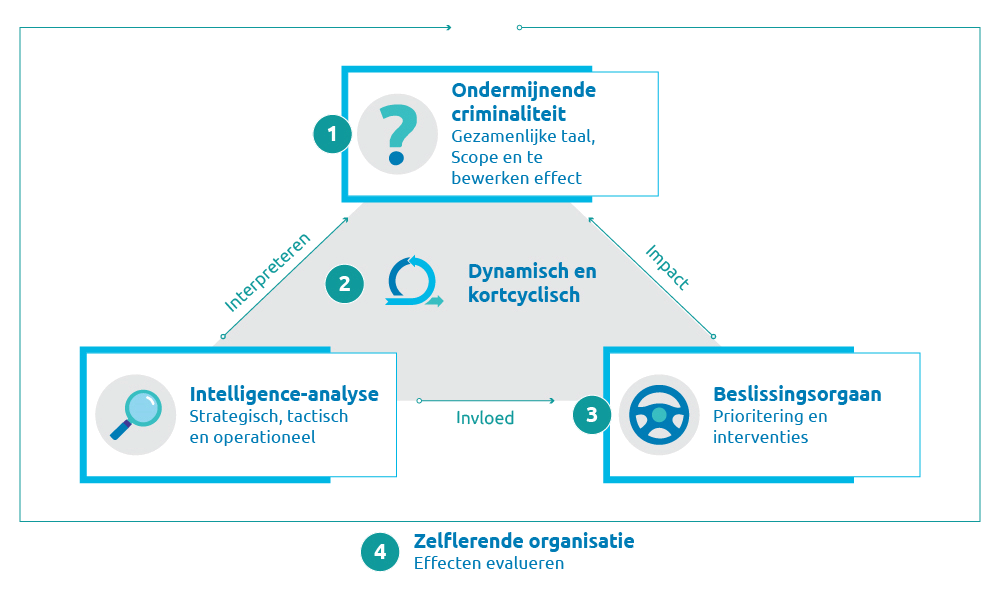 Het kort-cyclisch en dynamisch sturen vanaf de start van het intelligence proces, namelijk verzamelen van de noodzakelijke data, zorgt voor een betere inzet van capaciteit en keuzes van de uit te voeren interventies. Daarnaast worden inzichten gedemocratiseerd en kunnen partijen continue keuzes maken en eventueel bijsturen in het intelligence proces, duiding geven aan het domein en priortering aanbrengen. Intelligence is hierdoor – anders dan in het huidige proces – geen lineair proces van verzamelen, verwerken in een datawarehouse, analyseren en het nemen van interventies, maar een dynamisch en kort-cyclisch proces waarin de samenwerkingspartners in gezamenlijkheid vanuit hun expertise sturing aan geven.